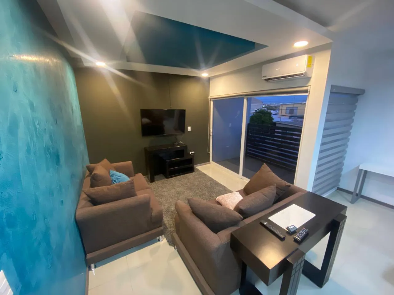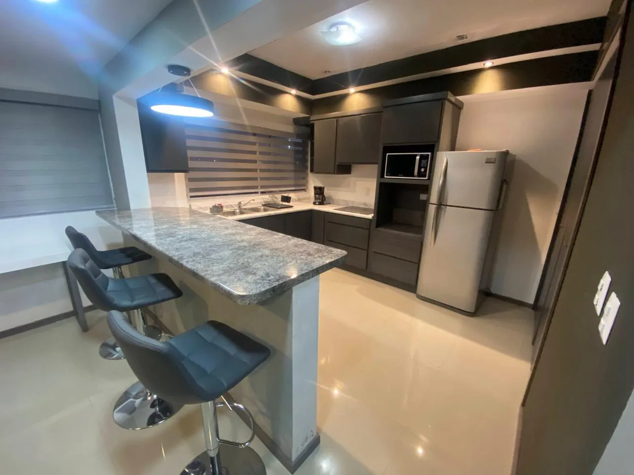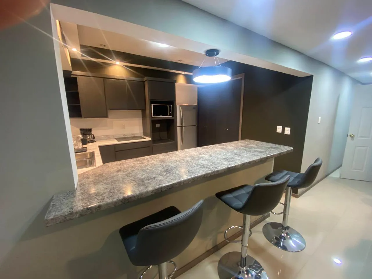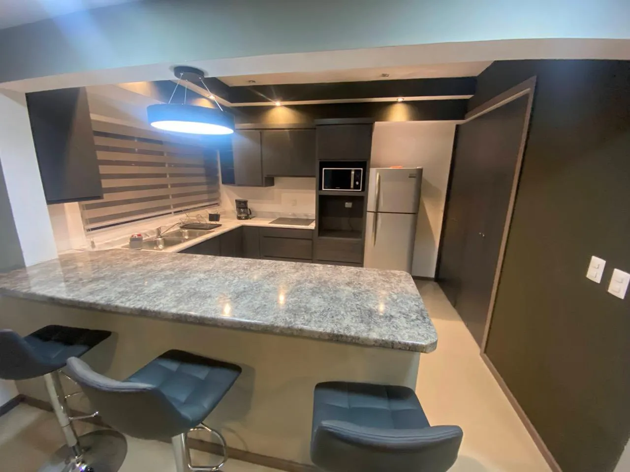 Diseño contemporáneo con pared de textura, iluminación empotrada y cocina de granito con barra. Sala de TV independiente.